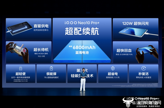 iQOO Neo10 Pro+搭载的6800mAh 超薄蓝海电池容量在目前的2K屏旗舰中持续保持领先,